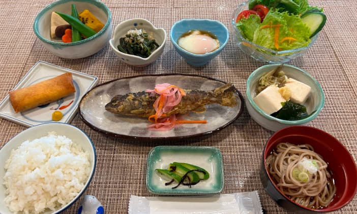 当館でご提供する食事は地元で採れる旬の食材をスタッフが心を込めて調理させて頂いております。